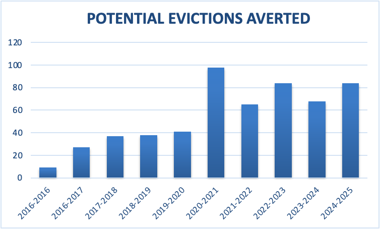 Our assistance helped to avert over 550 potential evictions and to avoid over 240 shut-offs of utilities.