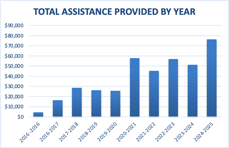 In 10 years, we have assisted over 2000 people.   We have provided almost $400,000 in assistance.  The amount of assistance has increased nearly every year due to rising rents, increased food costs, and other impacts on a family budget.